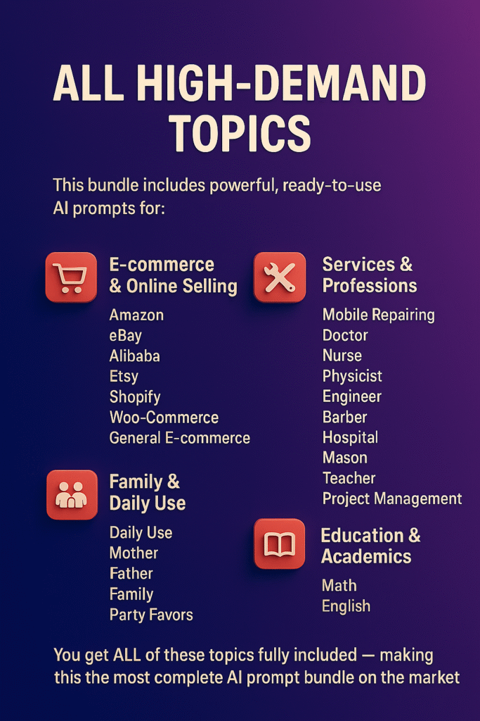 “I sell on multiple platforms and this bundle covers EVERYTHING. Amazon, Etsy, AliExpress—every prompt is ready to use. Best decision ever!”